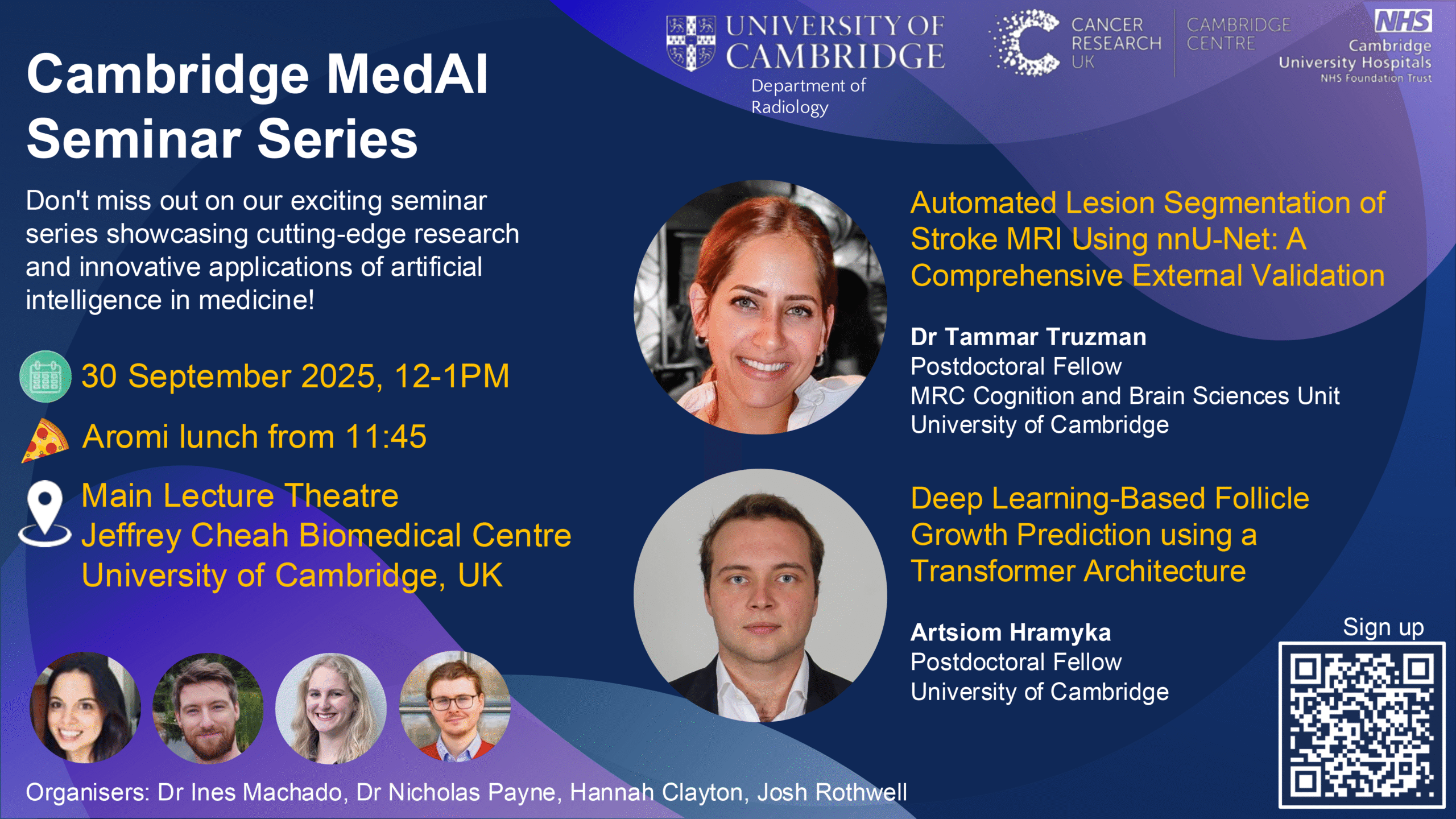 This month’s seminar will be held on Tuesday 30 Sept 2025, 12-1pm at the Jeffrey Cheah Biomedical Centre (Main Lecture Theatre), University of Cambridge and streamed online via Zoom.