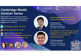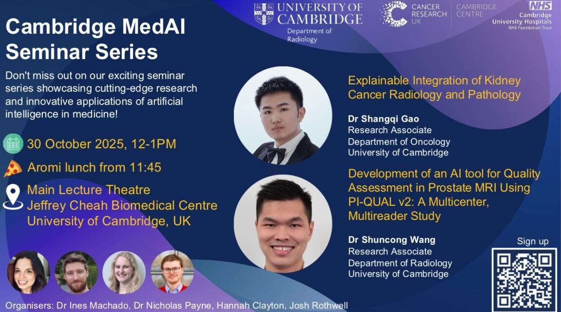 Dr Shangqi Gao and Dr Shuncong Wang present at the next Cambridge MedAI Seminar on Thursday 30 Oct 2025, 12:00 -13:00 at the Jeffrey Cheah Biomedical Centre, Main Lecture Theatre.